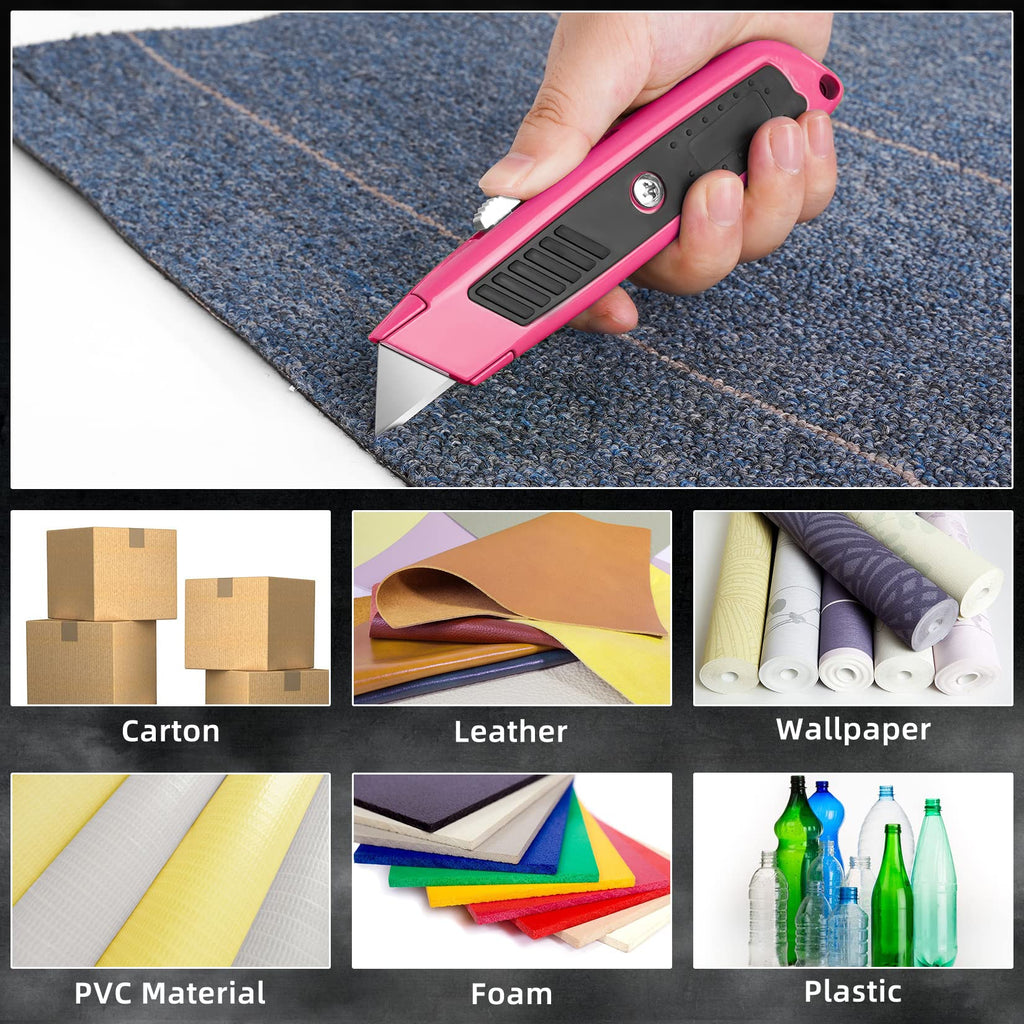- 【Wide Application】Our box cutters are suitable for cutting a variety of materials, whether it is paper, cardboard, leather, woven fabrics, wool fabrics, plastic, PVC or foam, this box cutter knife can cut quickly. The box knife retractable is small and easy to carry, and it is also a good choice for outdoor travel.