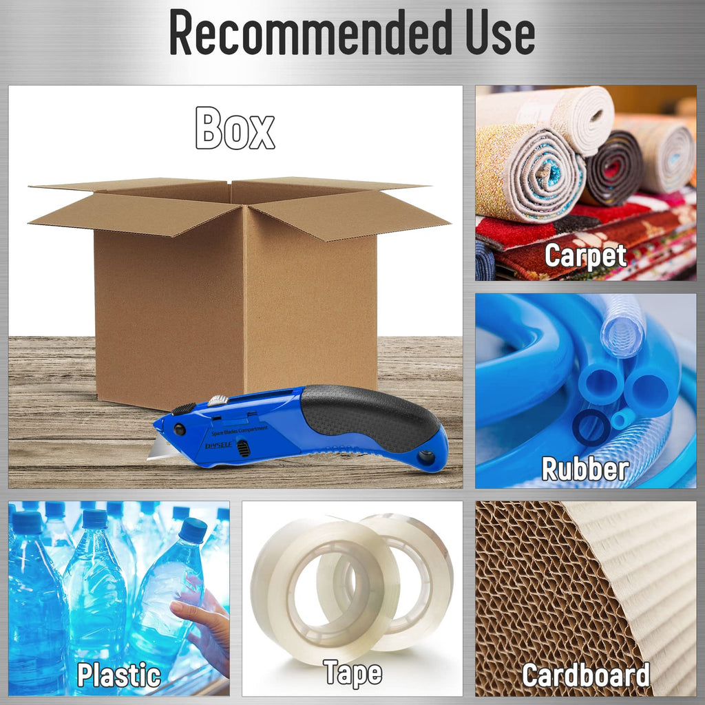 - 【Three-Gear Design】 The first gear, you can quickly cut paper, wallpaper, plastic. The second gear, you can cut paper boxes, cloth and carve. The third gear, you can cut leather, rubber and carpet deeply. The box cutters utility knives can be used in various scenarios.