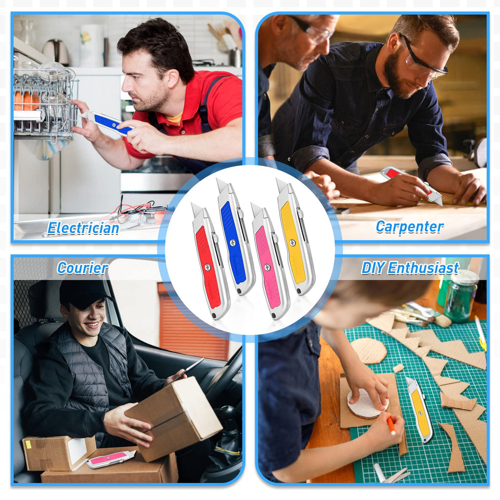 - Anti-Slip Design: These utility knives boast sturdy aluminum alloy bodies with resistant, colorful rubber shells that provide a secure, non-slip grip to prevent any potential injury. The self-locking mechanism design of each razor knife ensures the blade stays firmly in place during use, keeping you safe at all times.